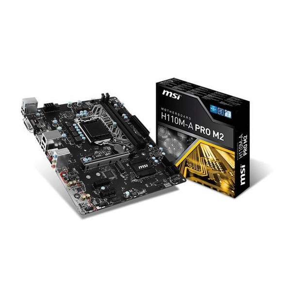 SpecificationsMfr Part Number: H110M-A PRO M2CPU: LGA1151Supports the 6thåÊGeneration Intel Core i7/ i5/ i3/ Pentium/ Celeron ProcessorsChipset: Intel H110Memory:åÊ2x DDR4-2133 DIMM Slots, Dual Channel, Max Capacity of 32GBSlots:åÊ1x PCI-Express 3.0 x16 Slot, 2x PCI-Express 2.0åÊx1åÊSlotsStorage:SATA: 4x SATA3 PortsM.2: 1x M.2 Port (Key M, type 2242/ 2260/ 2280), Support SATA3 & PCI-Express 2.0 x4 ModeAudio: Realtek ALC887 7.1-Channel High Definition Audio CODECLAN: Intel I219V Gigabit Ethernet ControllerPorts: 4x USB 3.1 Ports (1 Gen1 Type-A rear, 1 Gen1 Type-C rear, 2åÊvia header), 6x USB 2.0 Ports (4 rear, 2åÊvia header), 1x DVI-D Port, 1x HDMI Port, 1x RJ45 LAN Port, 1 x PS/2 Keyboard/Mouse Port, Audio I/O JacksPower Connector: 1x 24pin ATX Main Power Connector, 1x 8pin ATX 12V Power ConnectorForm Factor: MicroATX, 9.6 x 8.1 inch / 24.4 x 20.5 cm